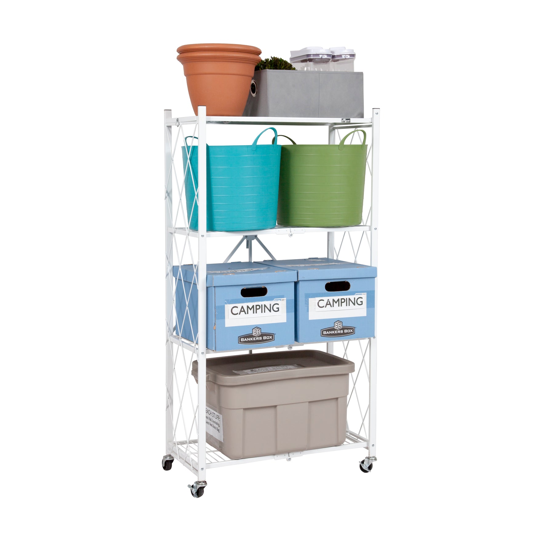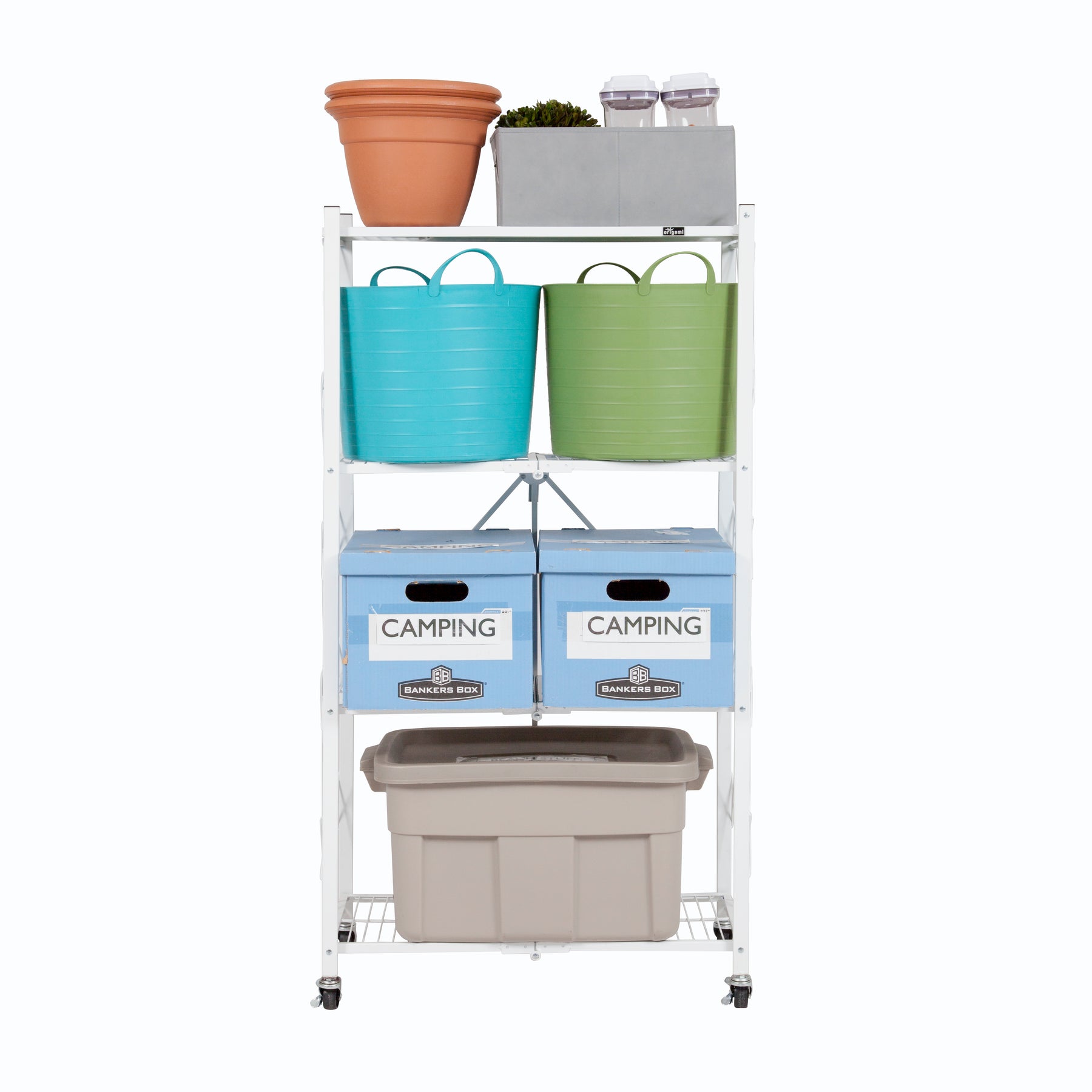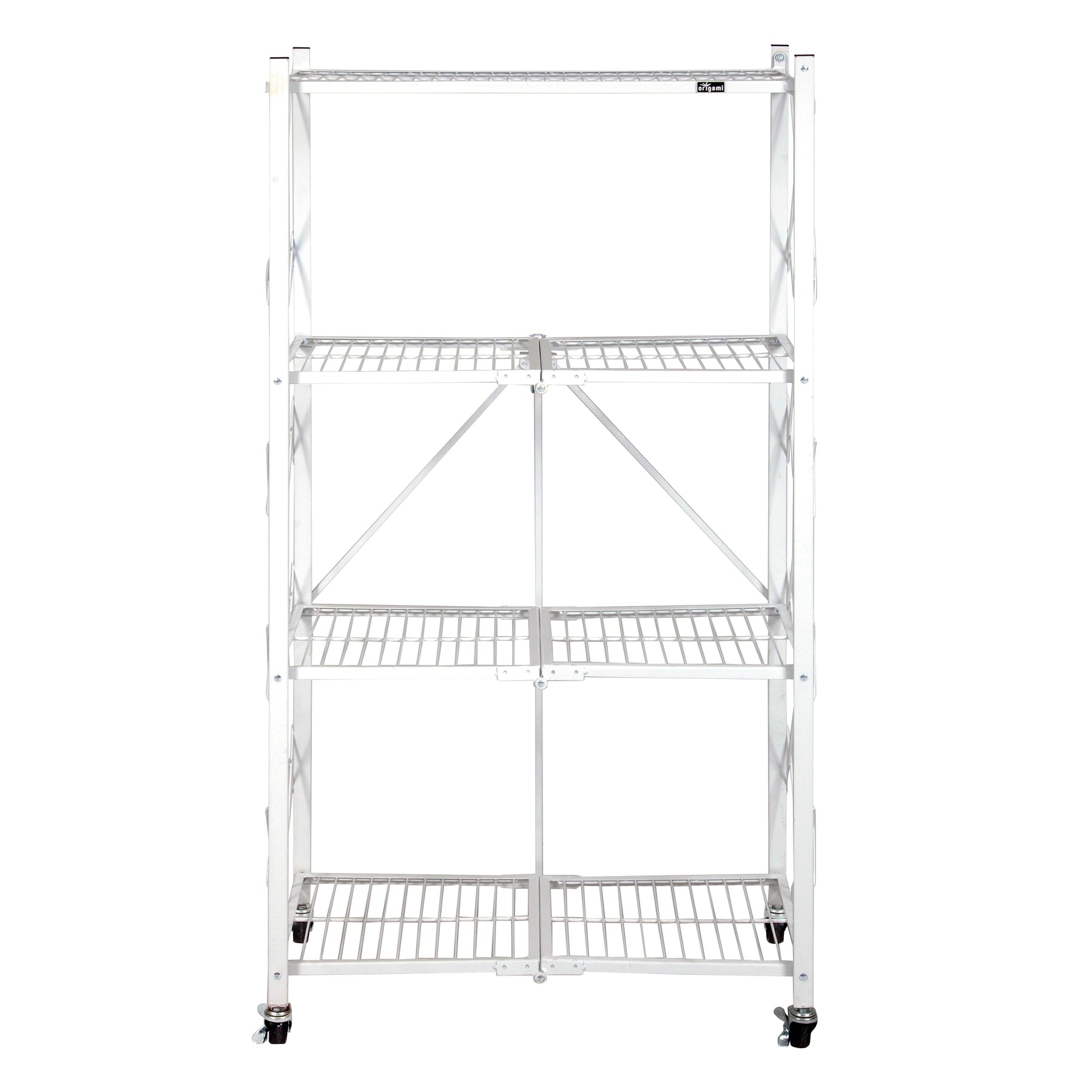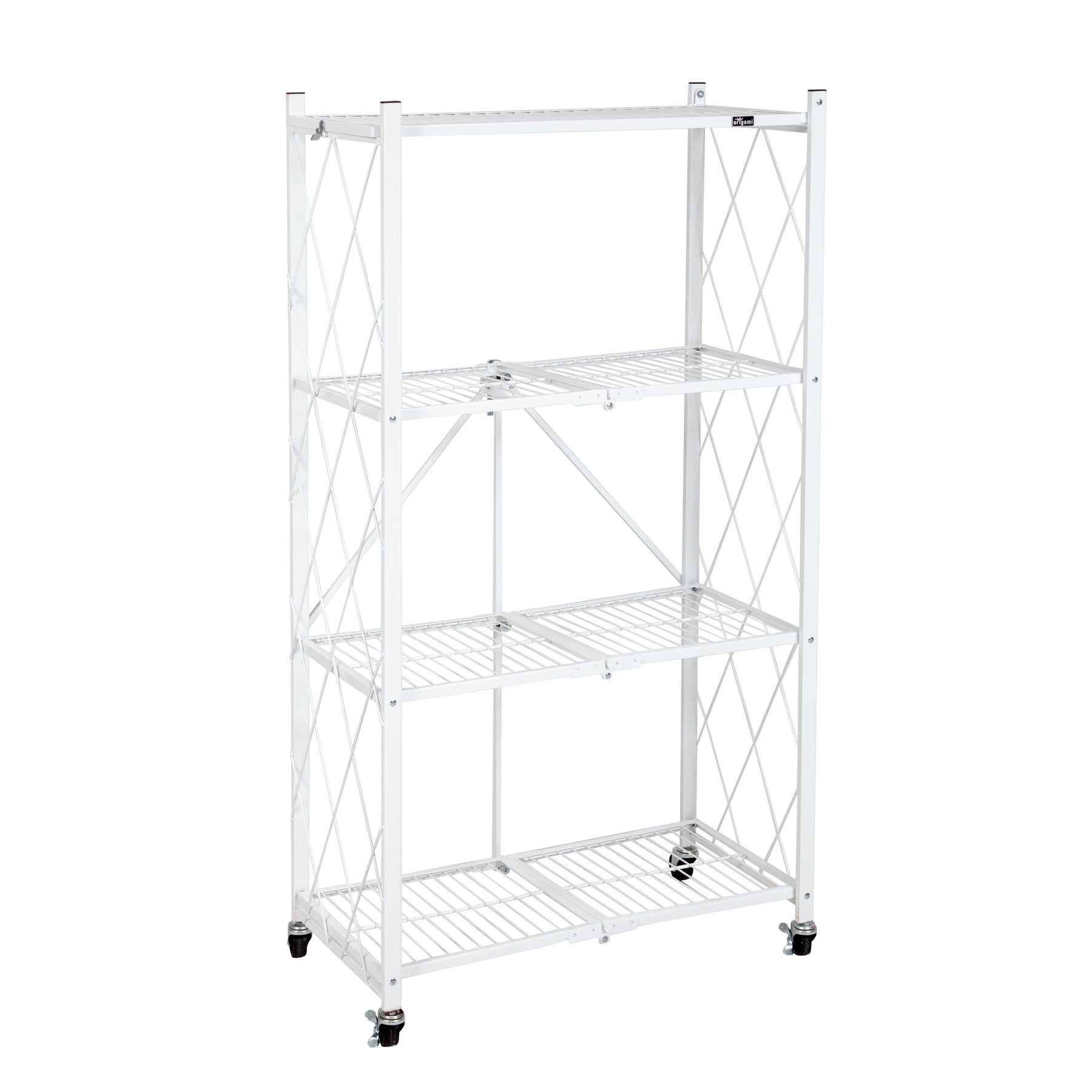 Origami 4-Shelf R4 Series Say hello to our newest heavy duty multi-functional storage rack. Our rock solid shelf can hold up to 160 LBs of your stuff. Not only is it functional but super easy to set-up. Unfold and latch and its ready to use in 20 seconds. No tools or assembly required! Organizing doesn't get any easier than this! Great for all your storage needs no matter the space.